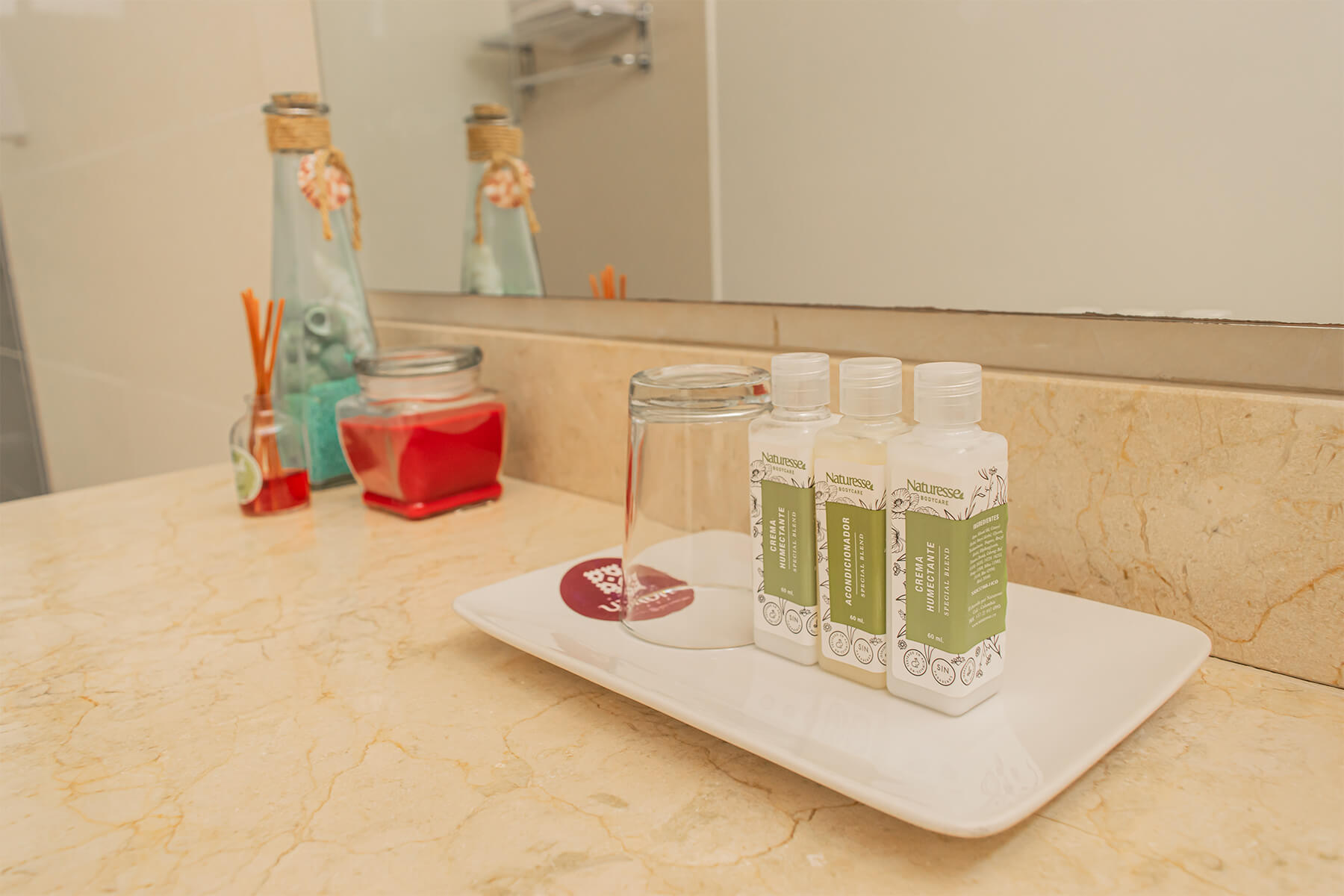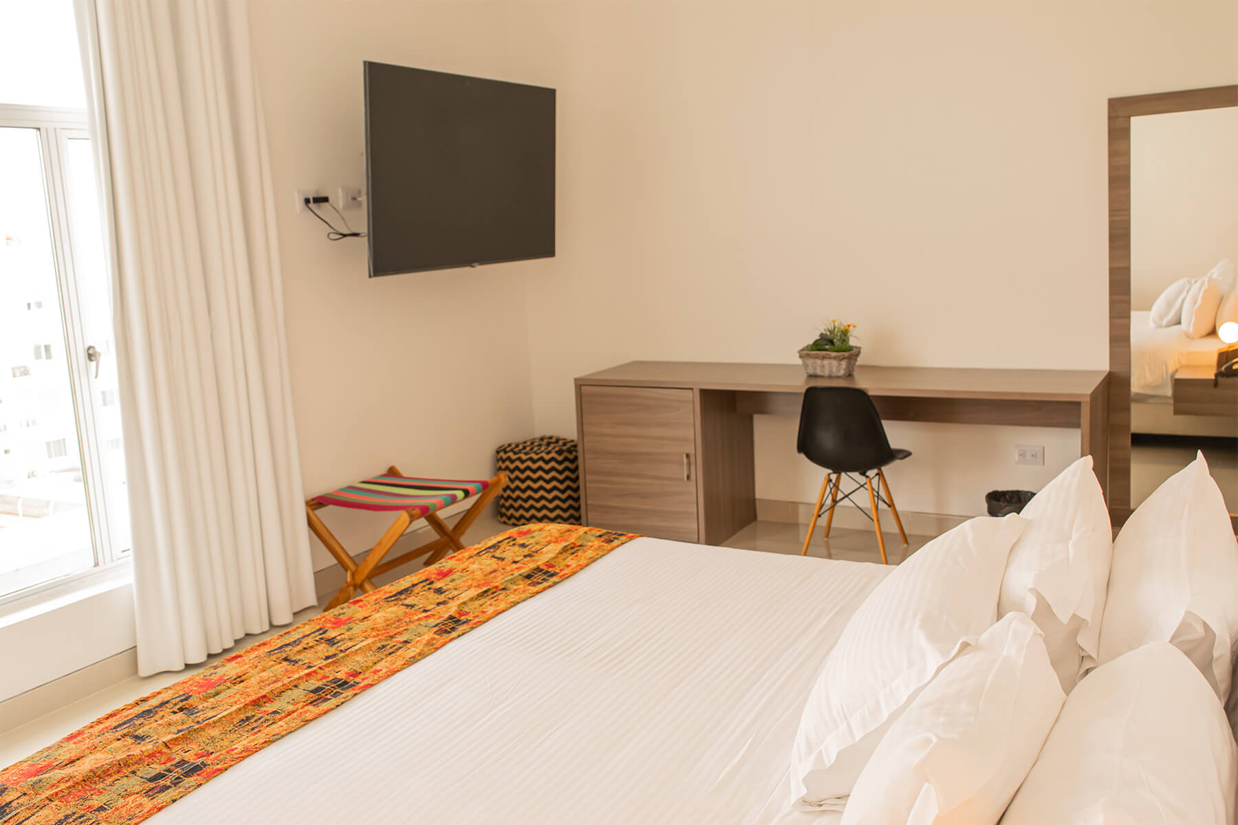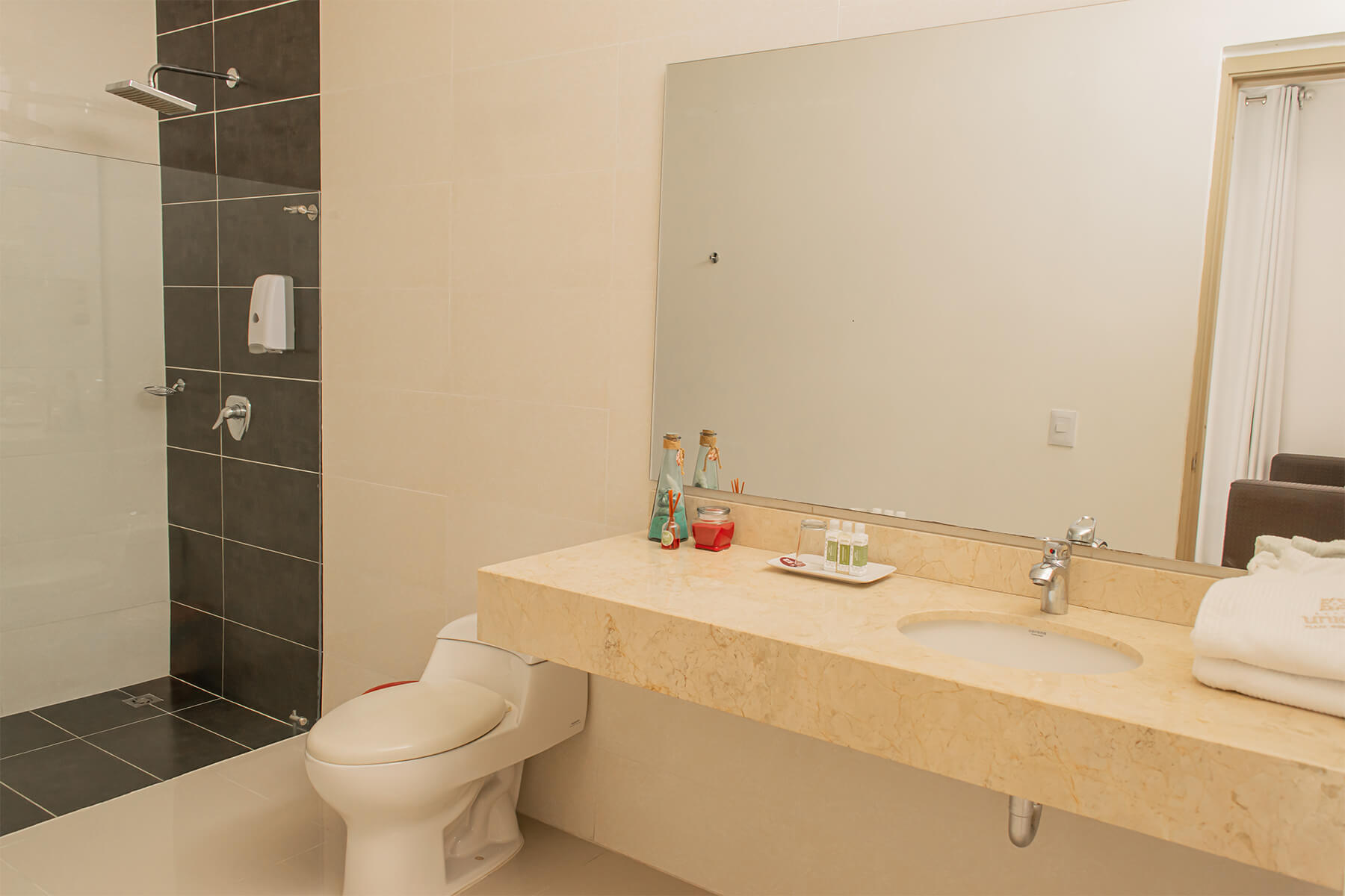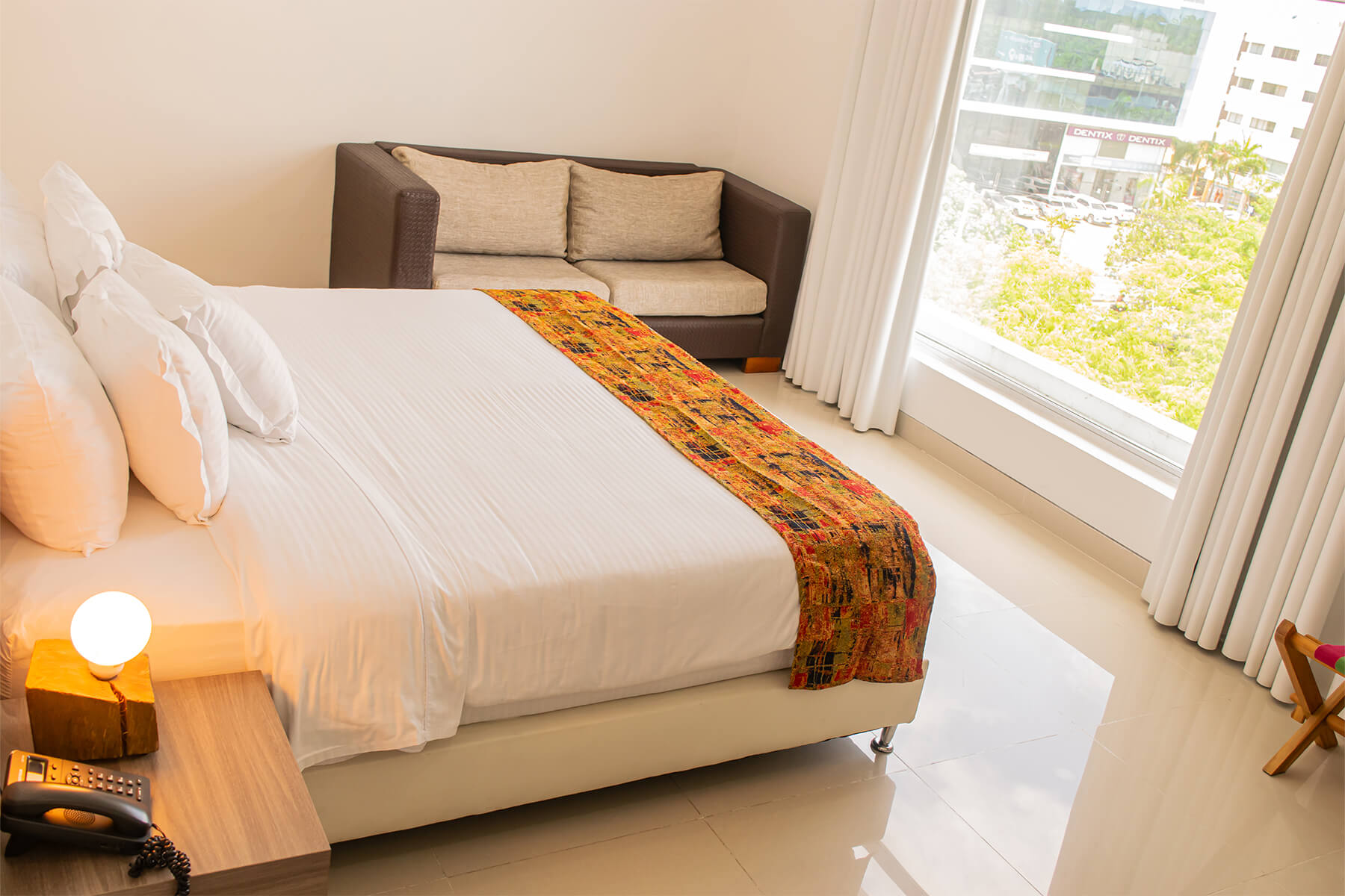 Si deseas confort en un espacio exclusivo y con el mejor ambiente, la habitación premium es tu elección. Está perfectamente equipada con una cama King Size de 2 x 2 metros, internet wi-fi ilimitado, TV LED de 40”, ventanas con aislamiento acústico, aire acondicionado, minibar, teléfono, cuarto de baño privado con ducha, amenities de baño, secador de pelo, closet amplio, mesa escritorio y mucho más.