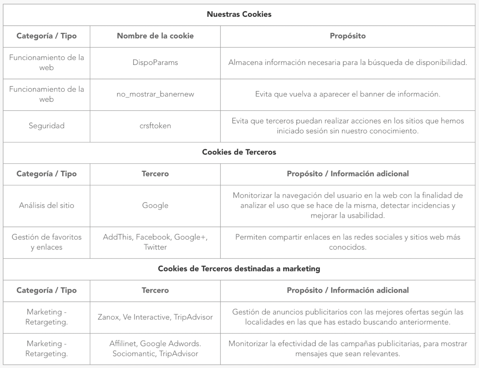 El acceso a la Web puede implicar el uso de cookies, aunque la página puede funcionar sin su uso. Las cookies son archivos pequeños que almacenan información en el navegador de cada usuario de modo que el servidor pueda reconocer cierta información que solamente el servidor pueda leer. Las cookies duran un tiempo limitado. Ninguna cookie permite revelar cualquier teléfono, correo electrónico u otros detalles de identificación. Las cookies no pueden extraer ninguna información del disco duro del usuario u obtener información personal sobre el mismo. La única manera que la información personal de un usuario puede formar parte de un archivo de la cookie es si el usuario personalmente da esta información al servidor.Aunque las cookies nos ayudan a optimizar su proceso de reserva, los usuarios que no deseen recibir las cookies o que no quieran que se informe de su visita, pueden configurar su navegador a tal efecto. Todos los navegadores de Internet tienen opciones disponibles en su configuración que permiten bloquear o permitir las cookies de sitios web concretos.